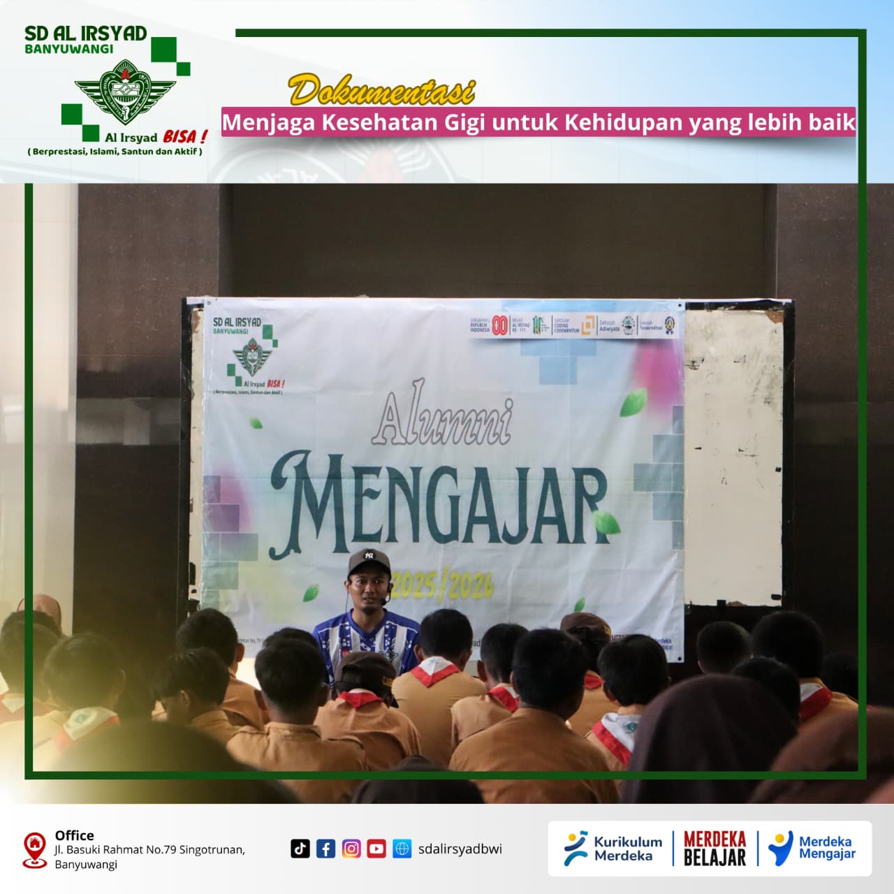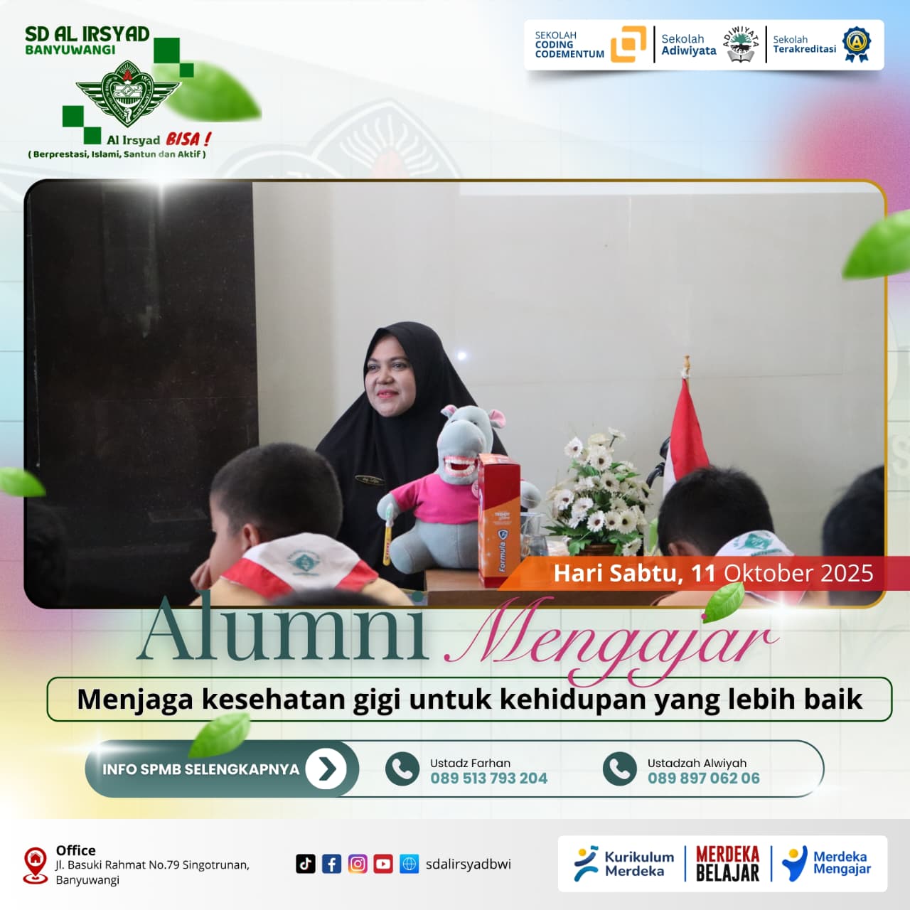 Sabtu, 11 Oktober 2025 – Program Alumni Mengajar SD Al Irsyad Banyuwangi menghadirkan drg. Zelfia, alumni tahun 1992. Beliau merupakan dokter gigi sekaligus Kepala Puskesmas Mojopanggung Banyuwangi, serta wali murid dari Rania (kelas 1).