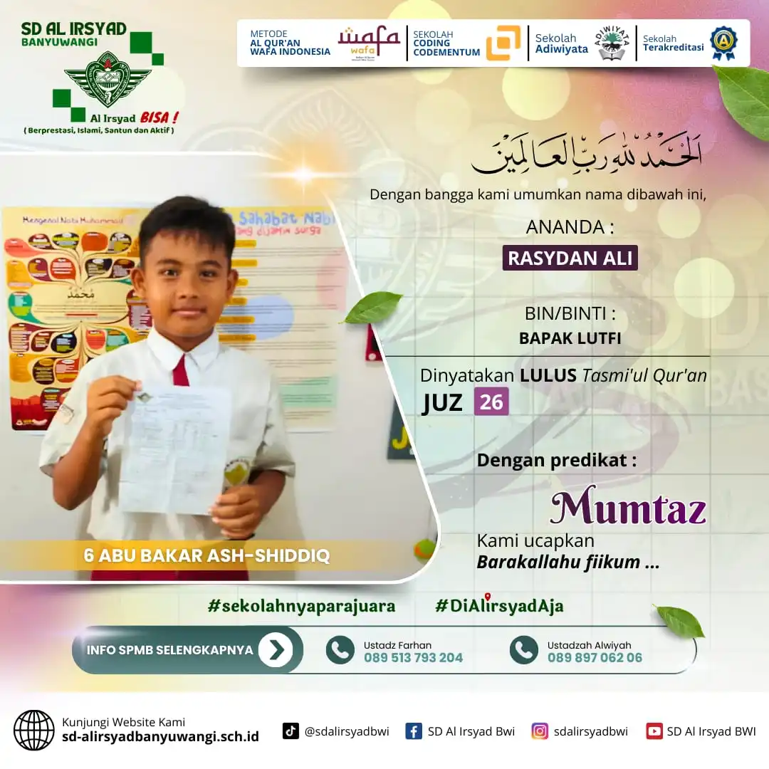 Alhamdulillah, kabar gembira kembali datang dari siswa-siswi hebat SD Al-Irsyad Banyuwangi.Pada ajang Olimpiade IPA, Matematika, dan Bahasa Inggris, dua siswa ...