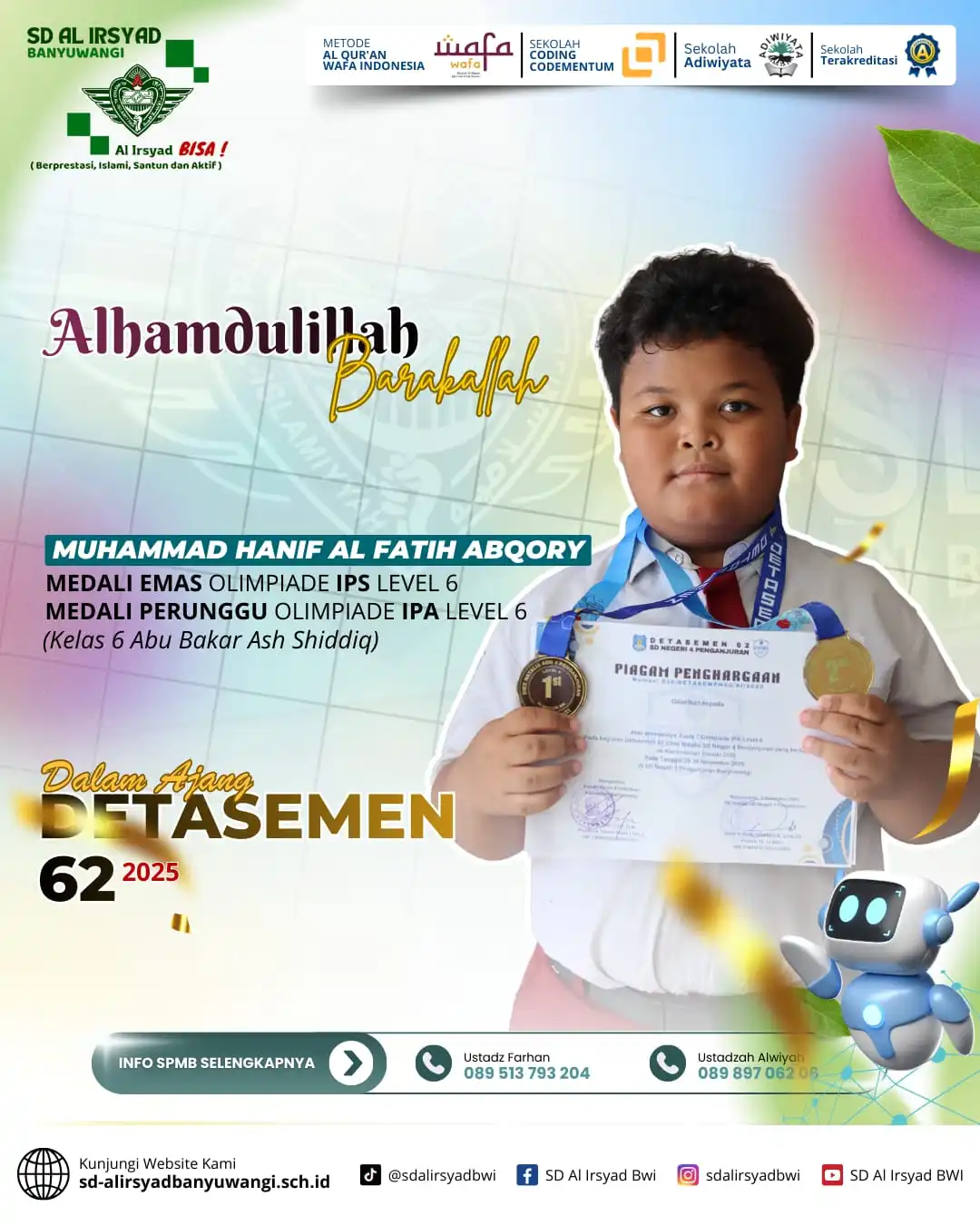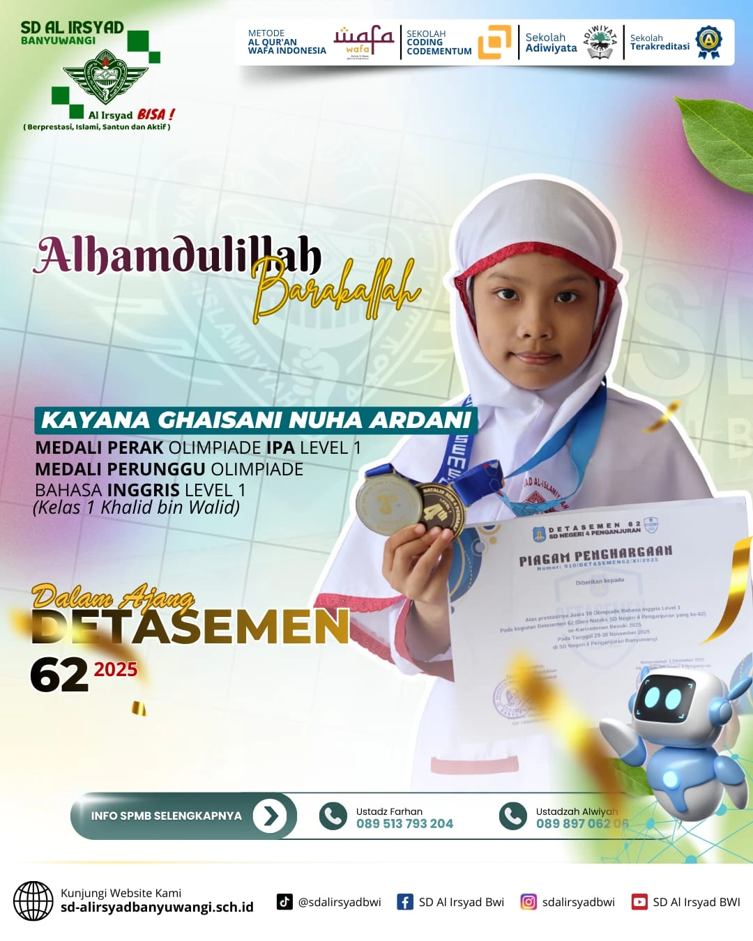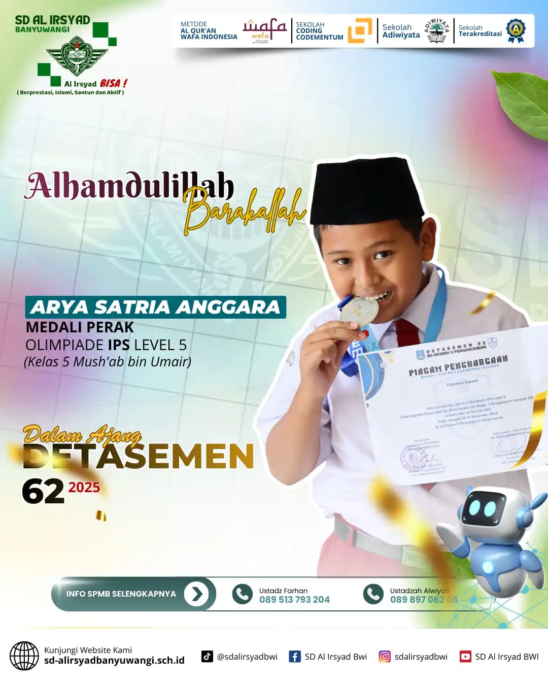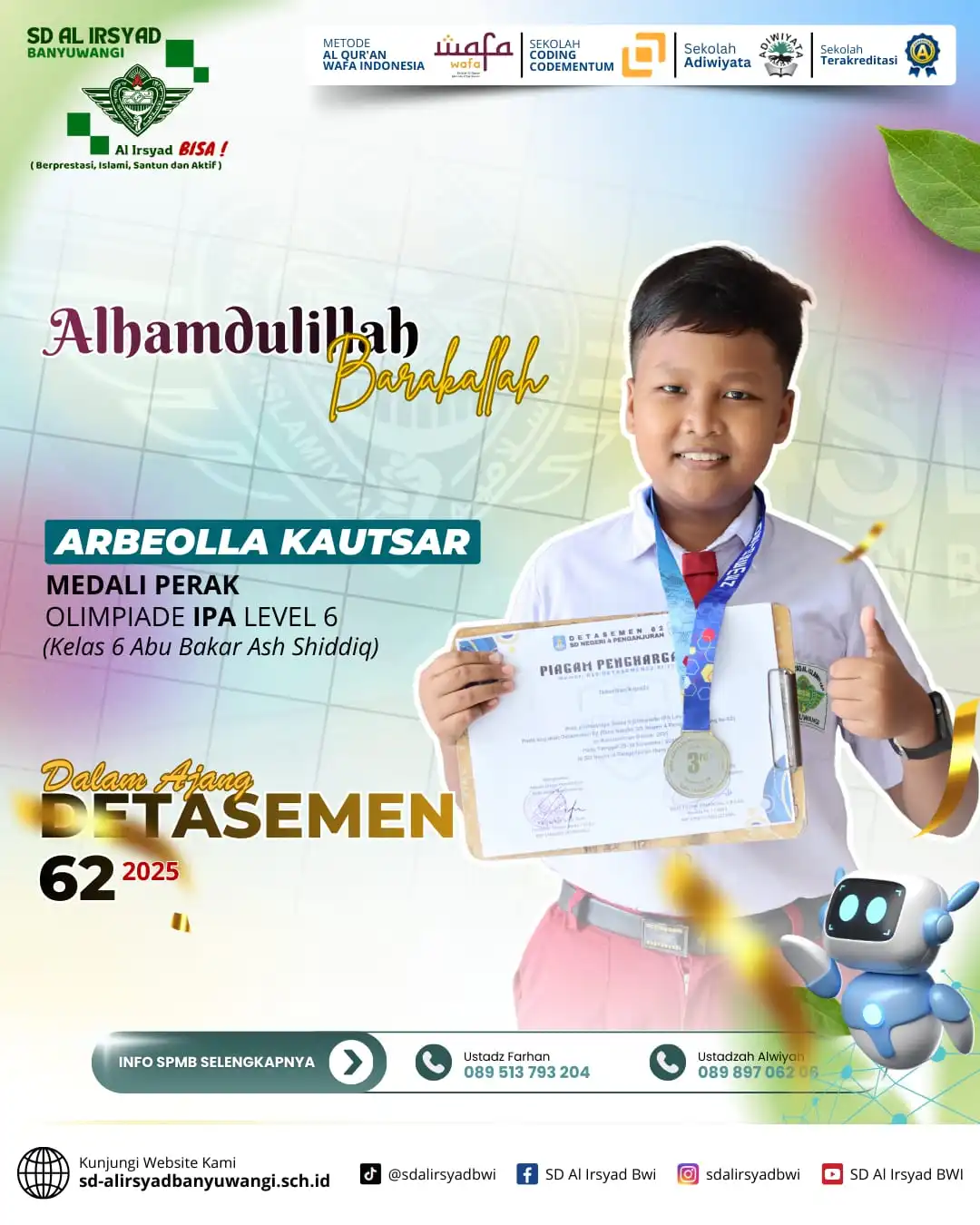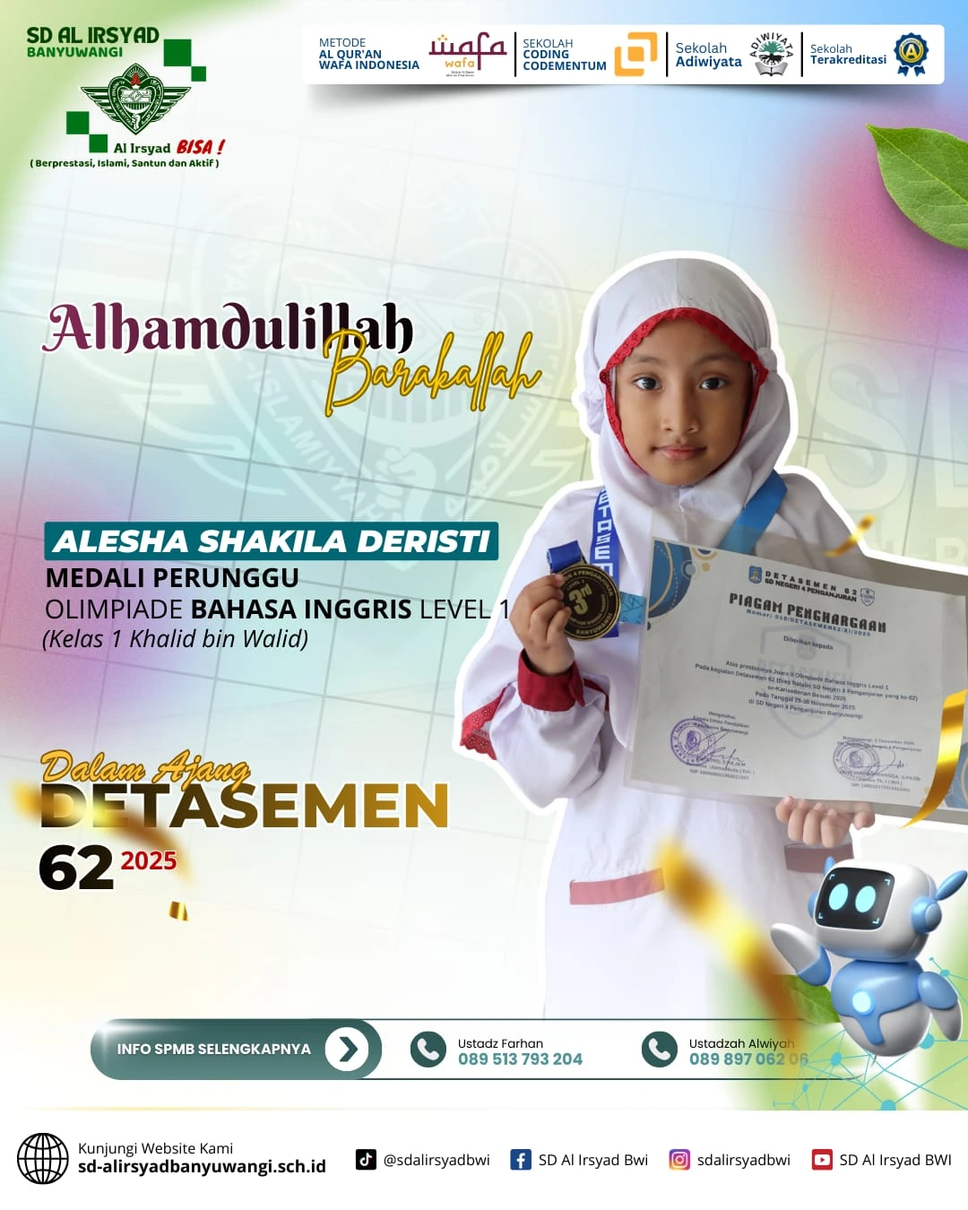 Alhamdulillah, dengan limpahan rahmat dan pertolongan Allah Subhanahu wa Ta’ala, siswa-siswi SD Al Irsyad Banyuwangi kembali menorehkan tinta emas prestasi dalam Olimpiade Detasemen 62 Alsyaba.
