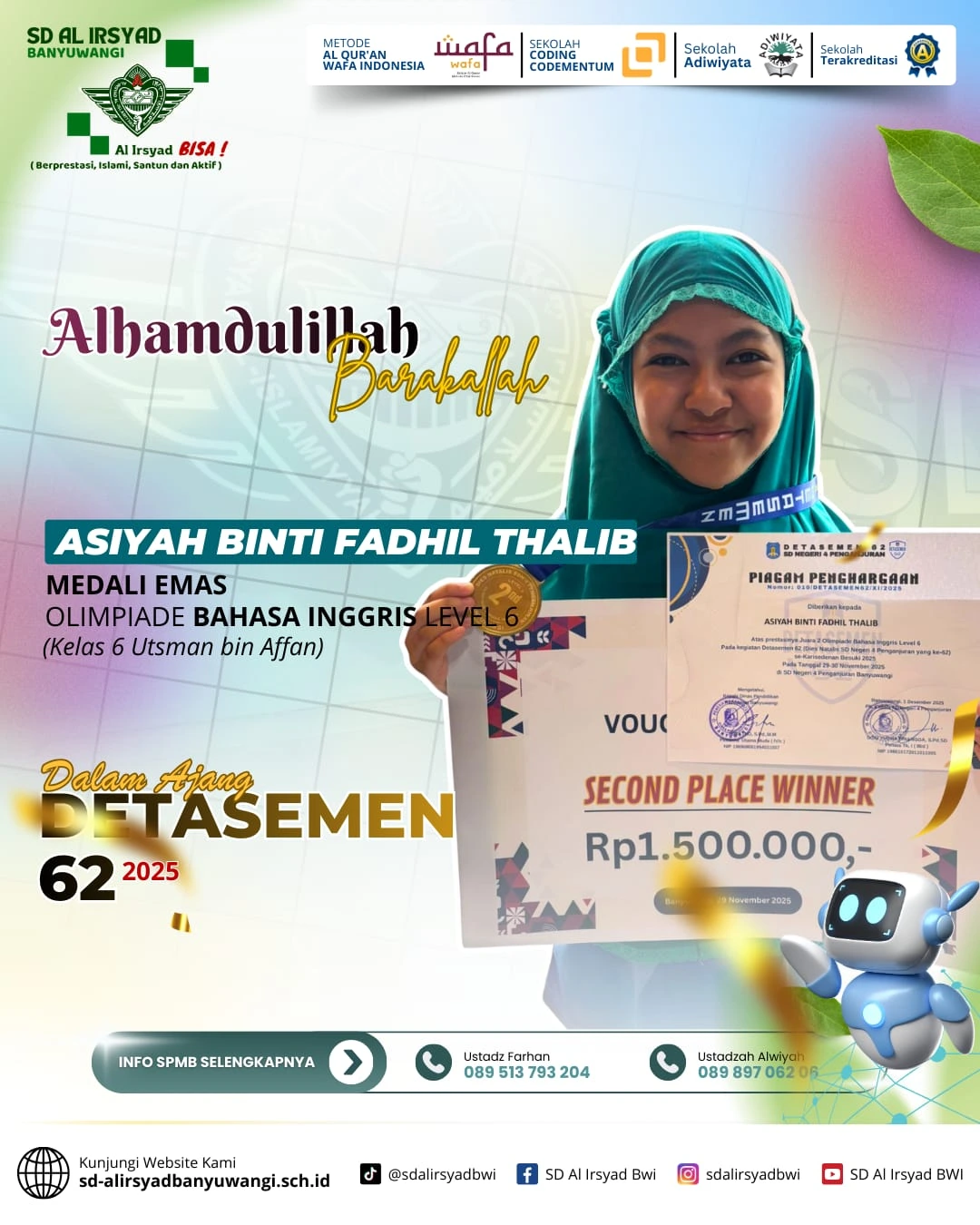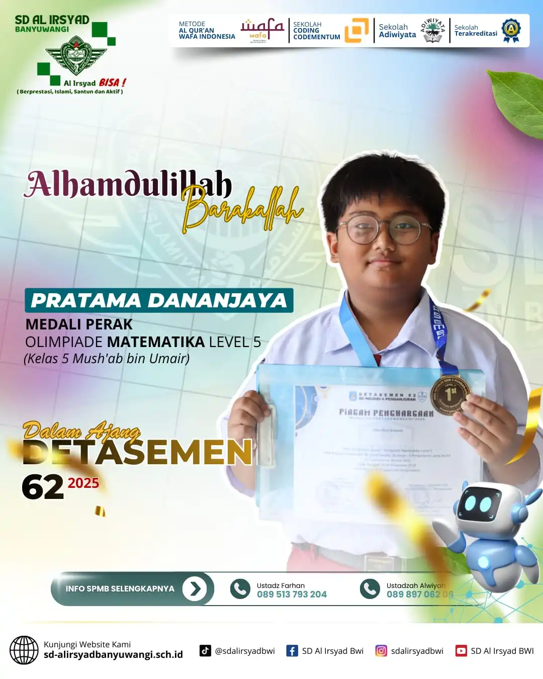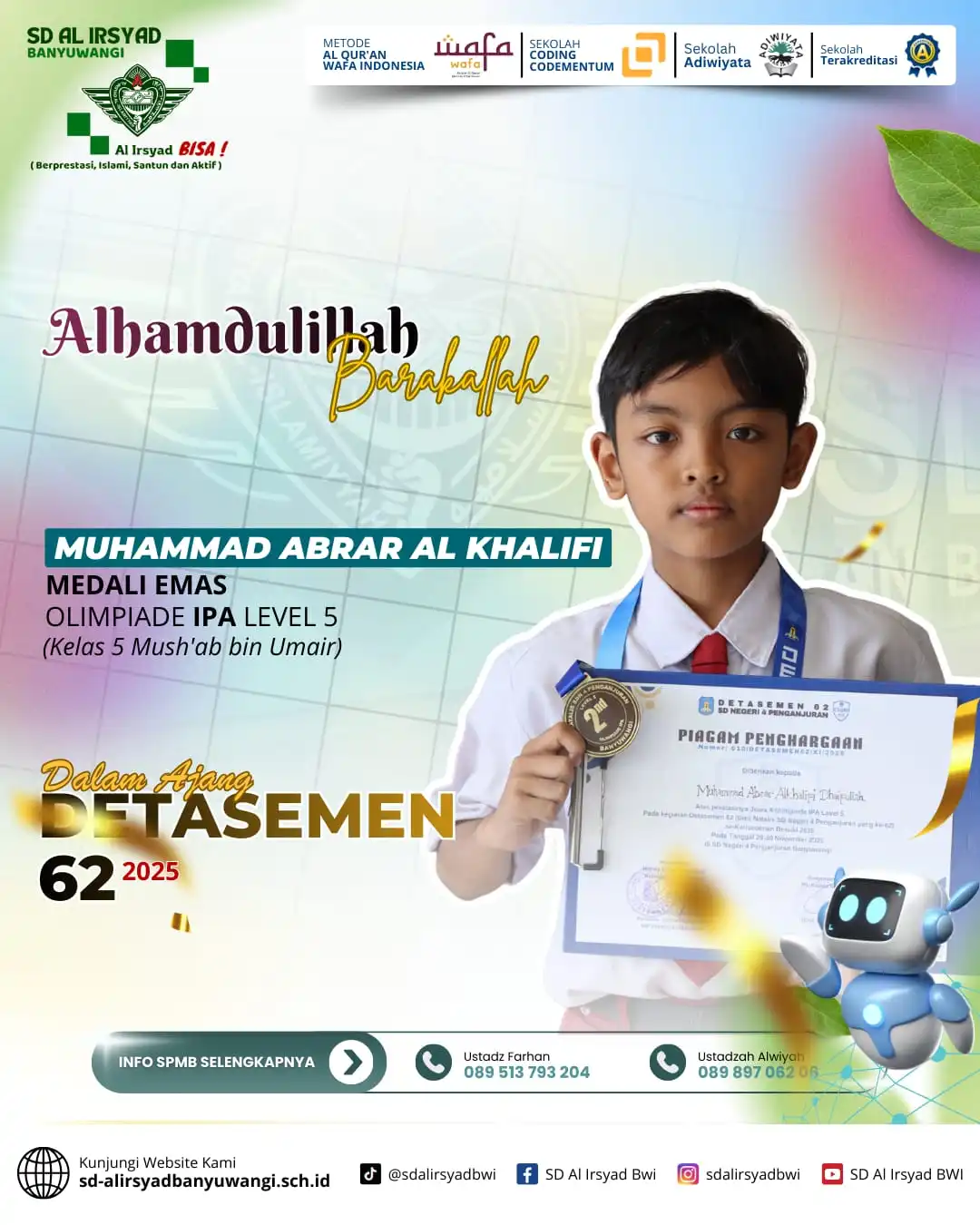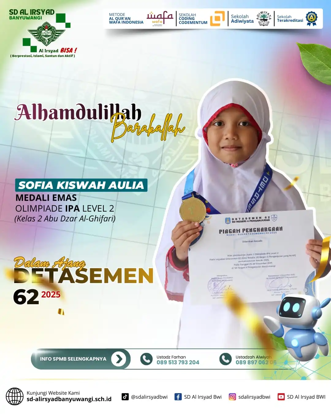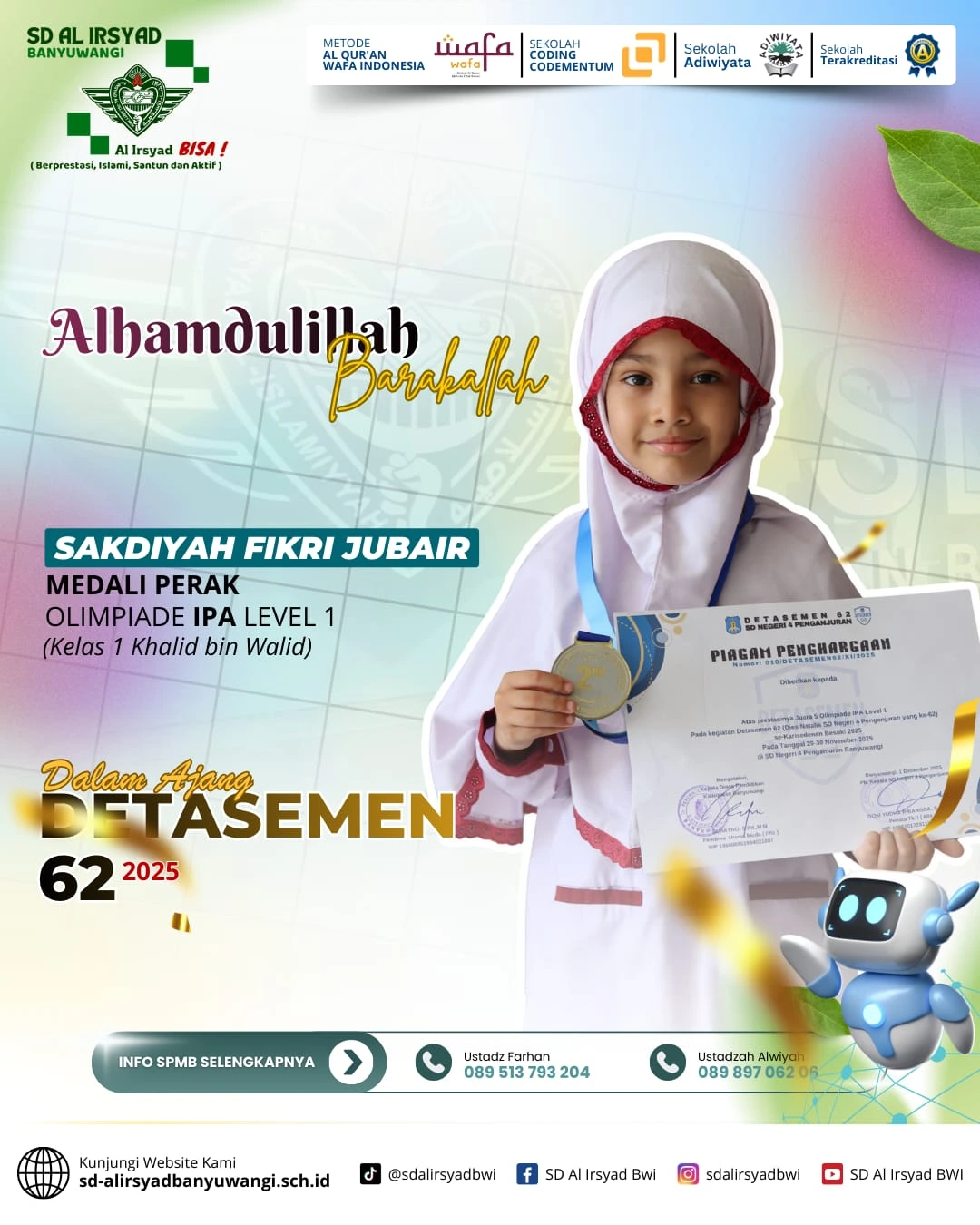 Alhamdulillah, dengan limpahan rahmat dan pertolongan Allah Subhanahu wa Ta’ala, siswa-siswi SD Al Irsyad Banyuwangi kembali menorehkan tinta emas prestasi dalam Olimpiade Detasemen 62 Alsyaba.