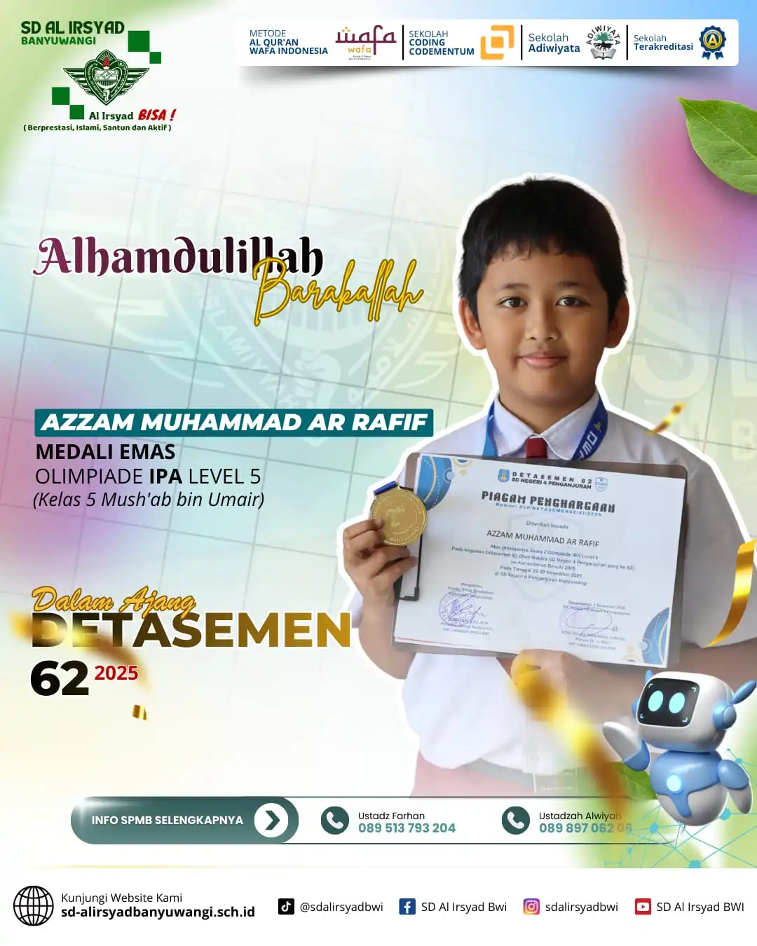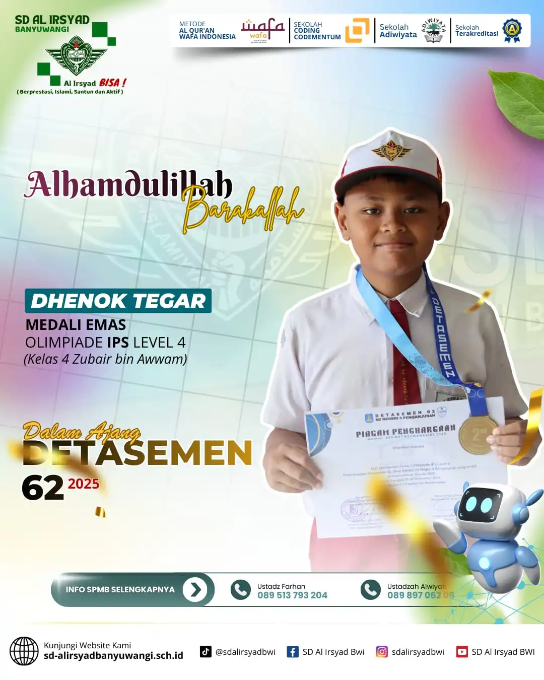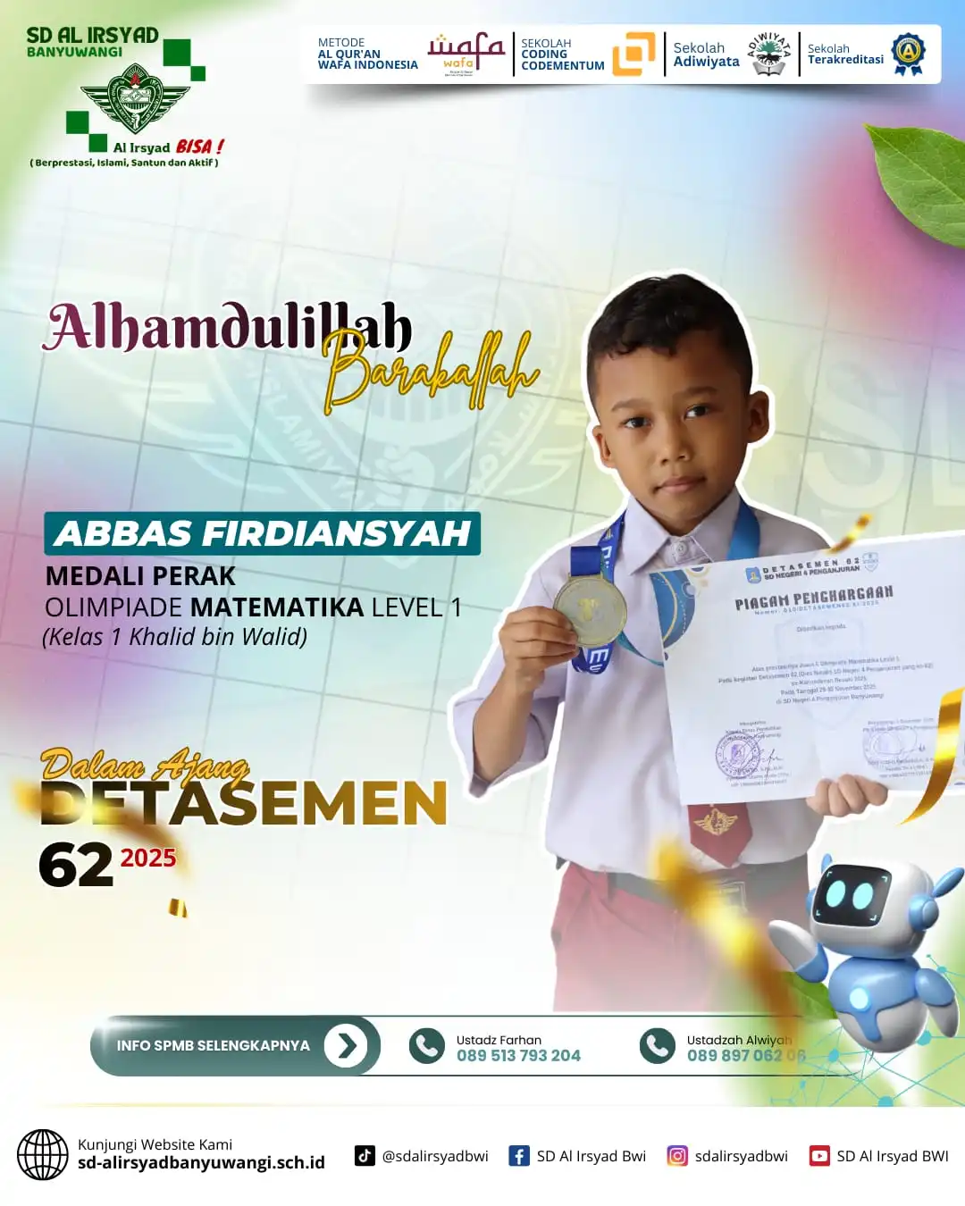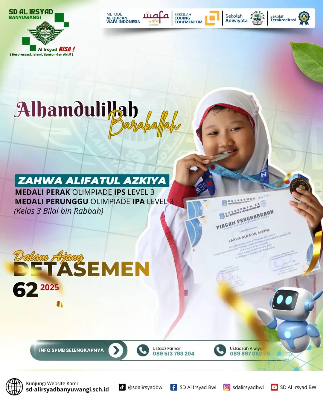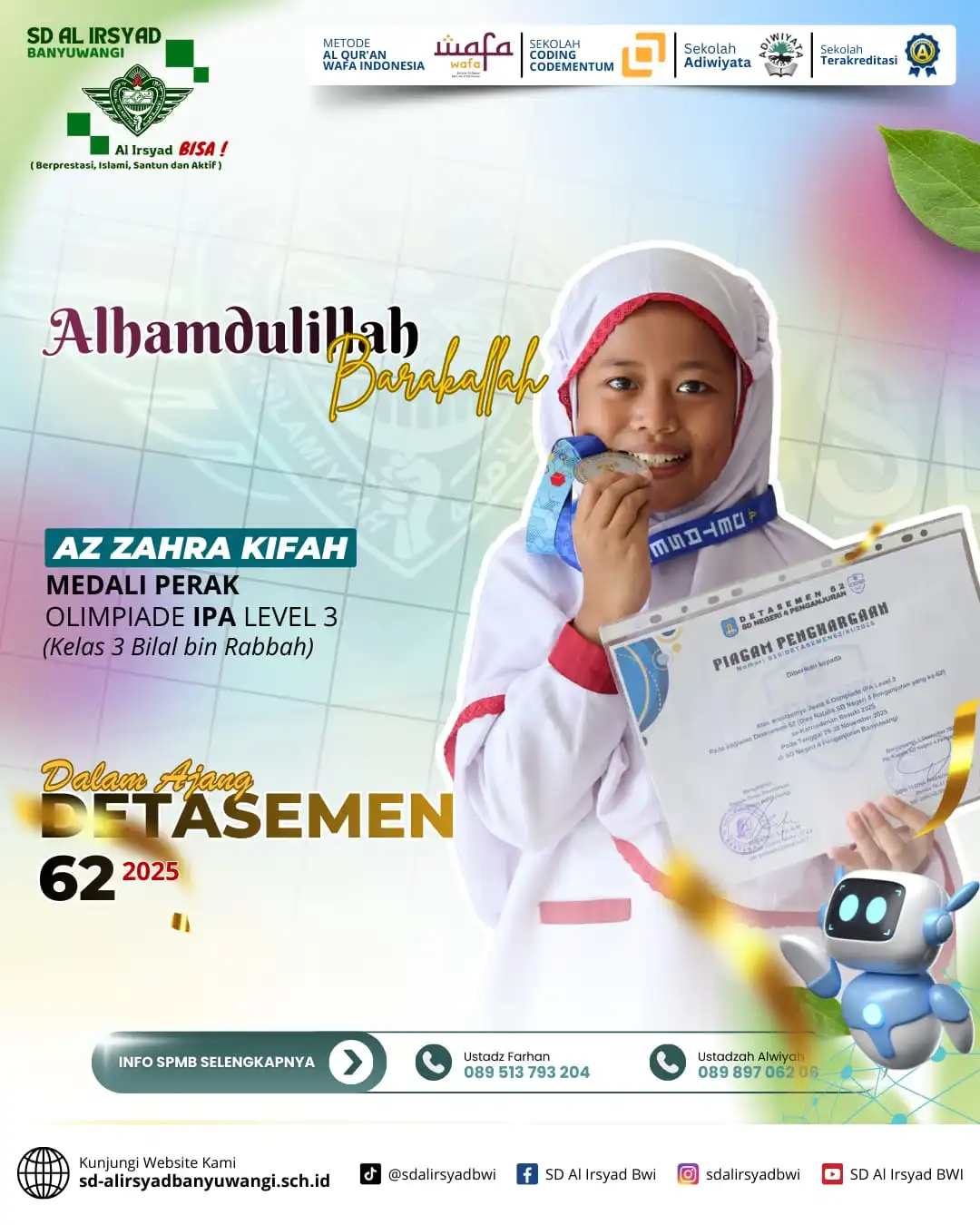 Alhamdulillah, dengan limpahan rahmat dan pertolongan Allah Subhanahu wa Ta’ala, siswa-siswi SD Al Irsyad Banyuwangi kembali menorehkan tinta emas prestasi dalam Olimpiade Detasemen 62 Alsyaba.