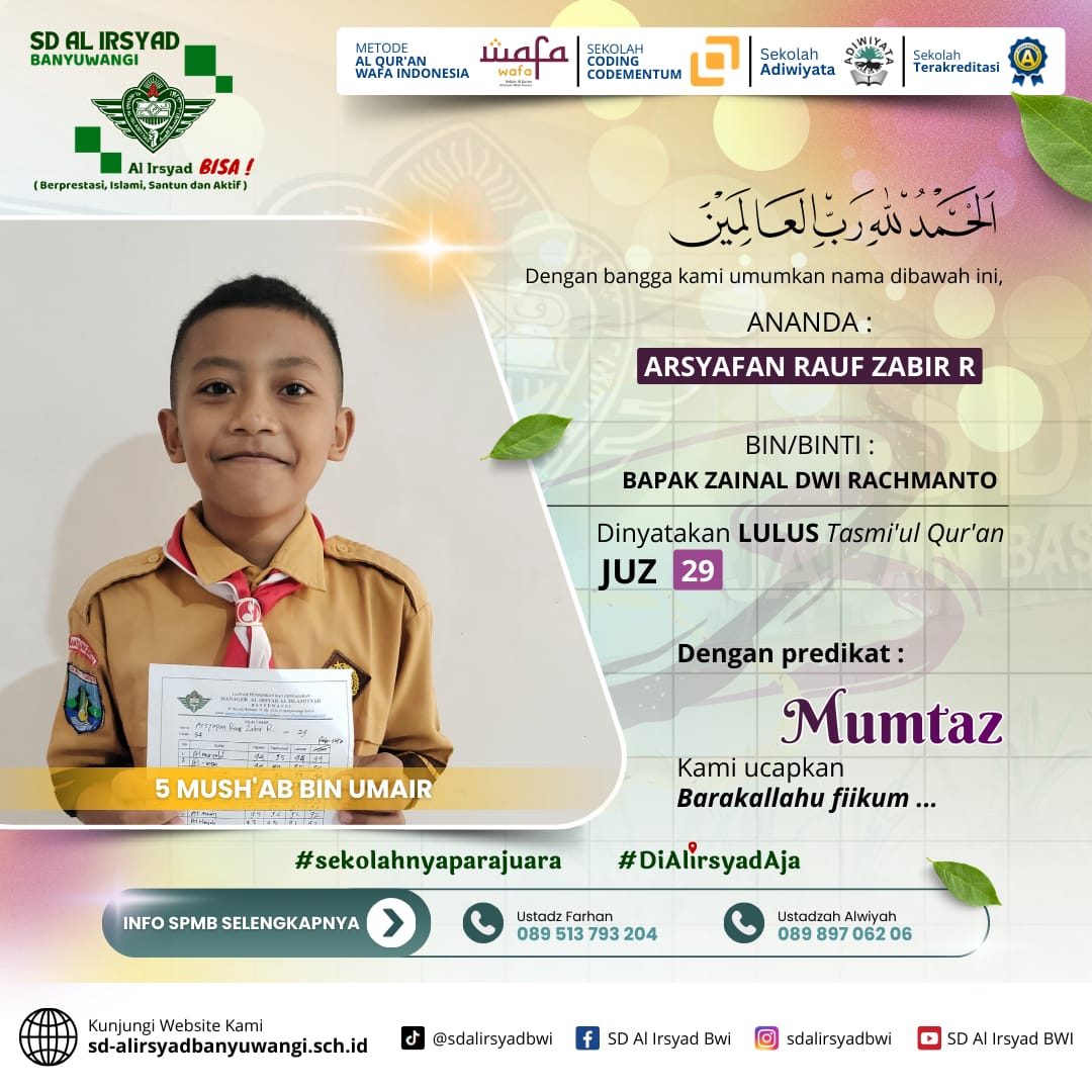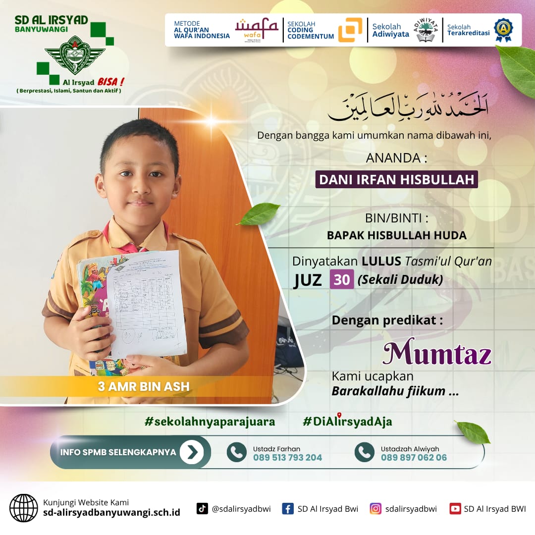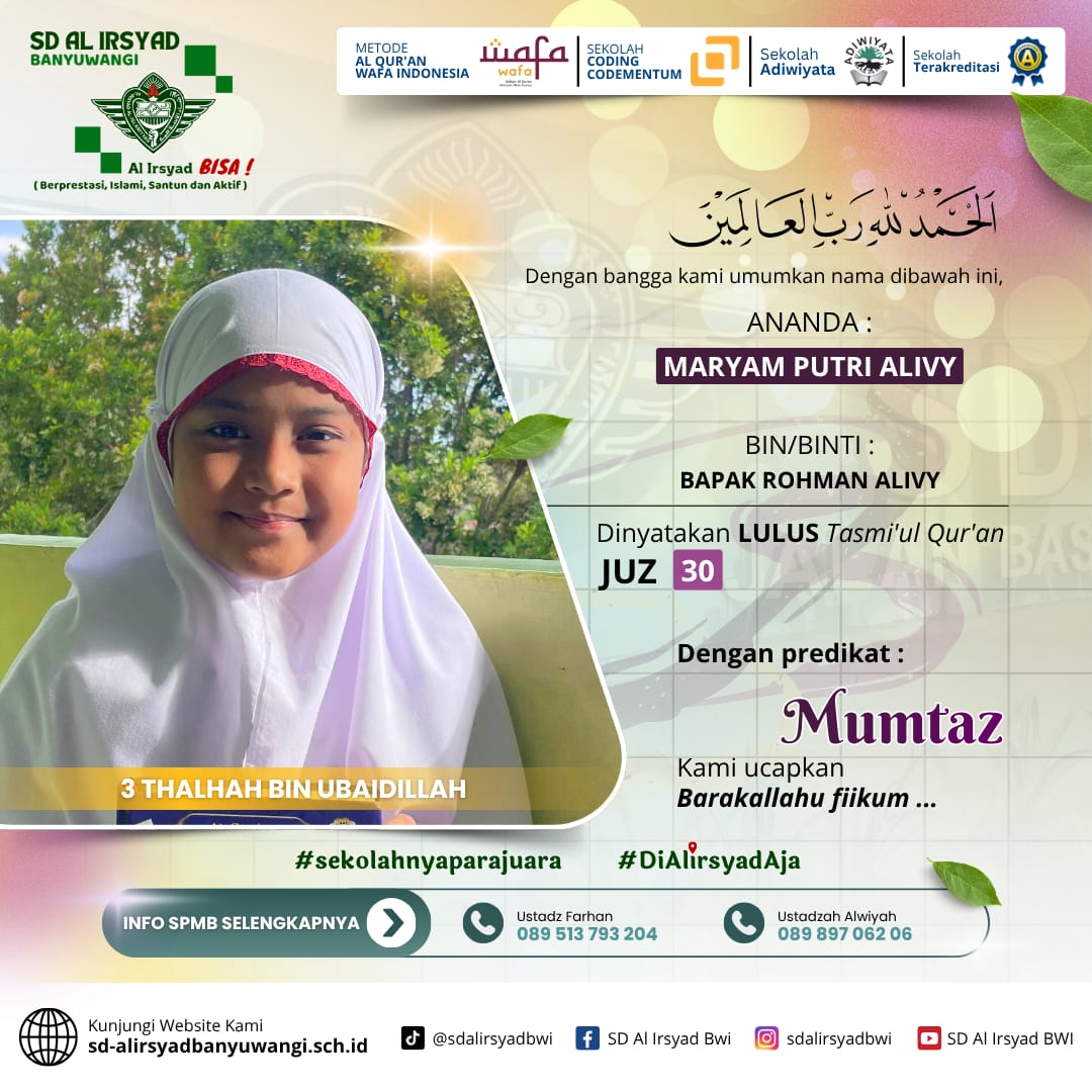 Bagi Ayah Bunda yang menginginkan pendidikan terbaik berbasis Al-Qur’an, SD Al Irsyad Banyuwangi menghadirkan: