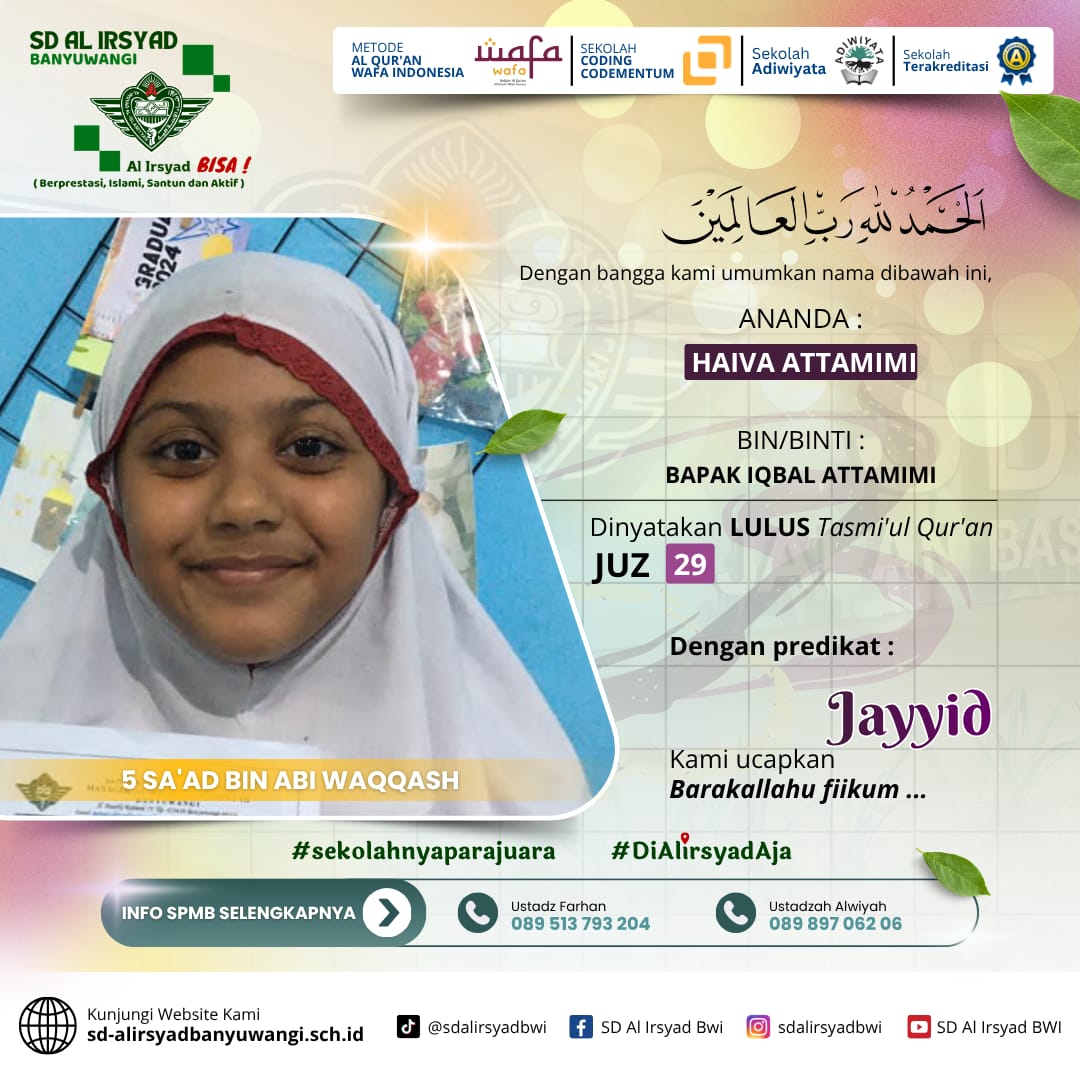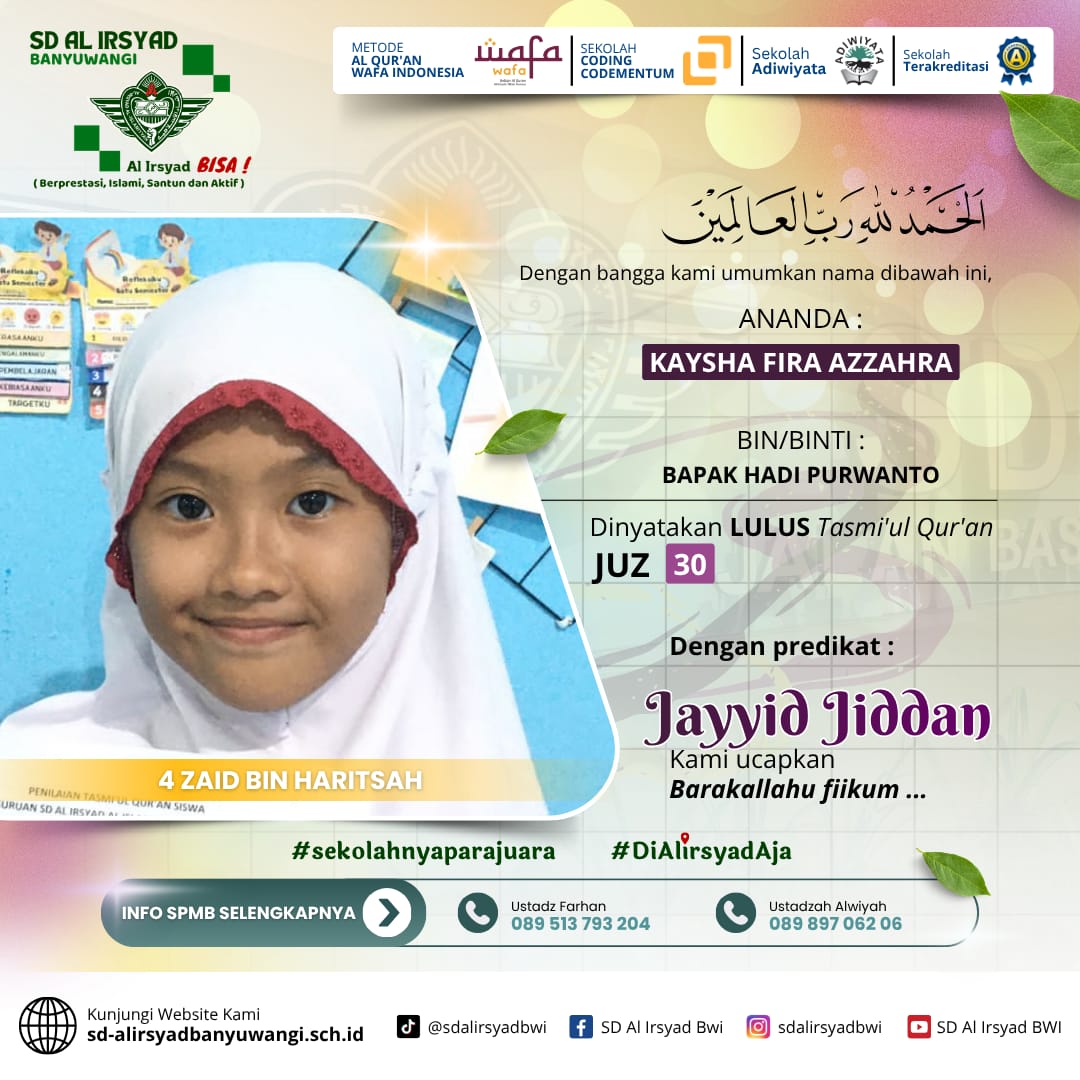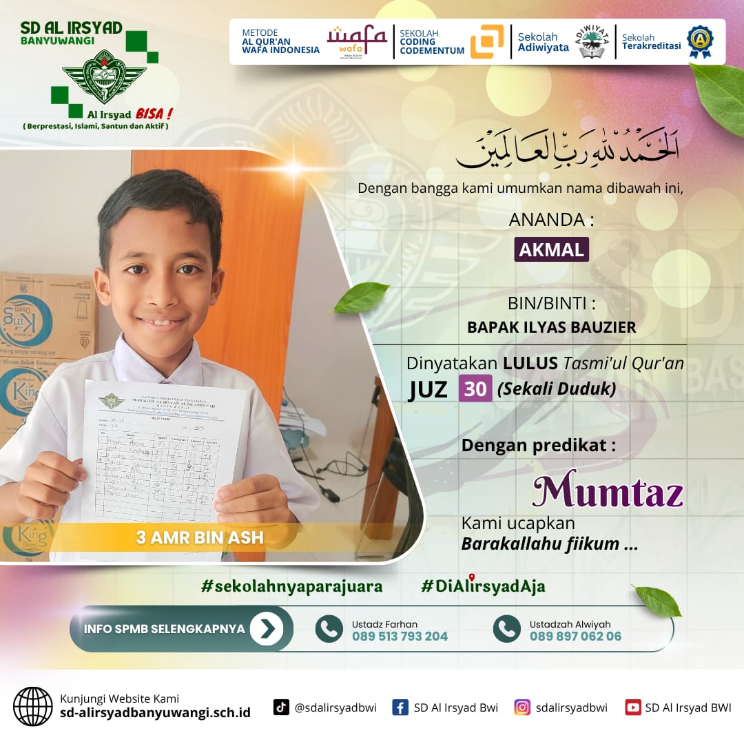Melalui kegiatan ini, SD Al Irsyad Banyuwangi menegaskan posisinya sebagai sekolah Islam unggulan dengan program tahfidz terbaik di Banyuwangi. Tasmi’ menjadi bukti bahwa Al-Qur’an tidak hanya dihafal, tetapi juga dijaga dan dihidupkan dalam keseharian siswa.