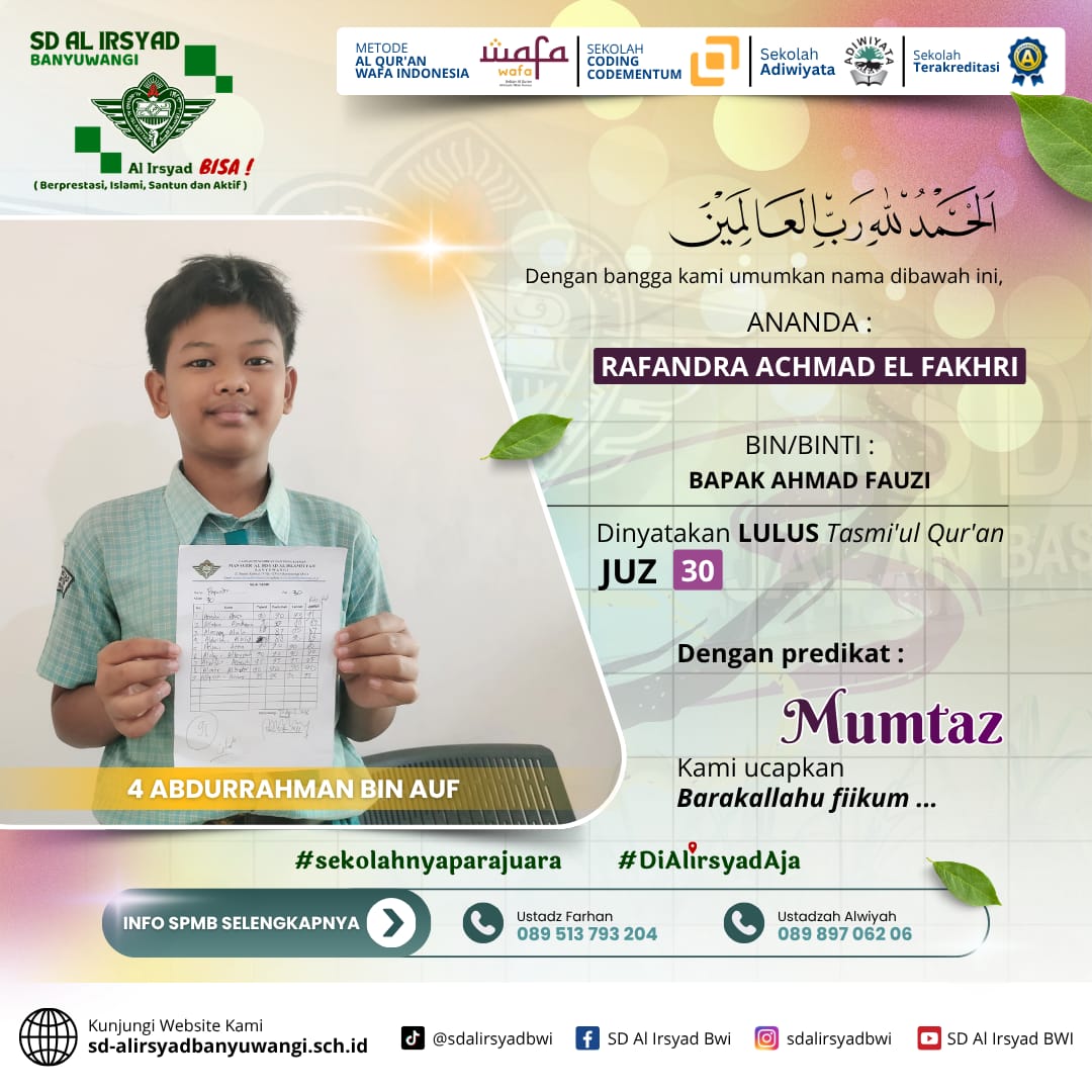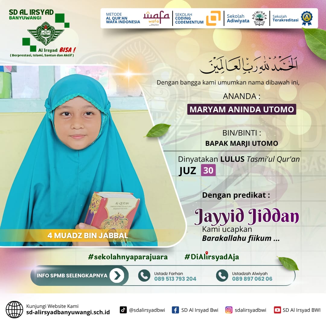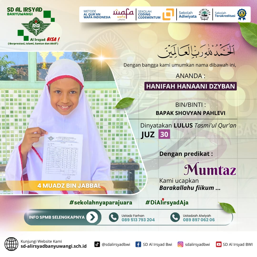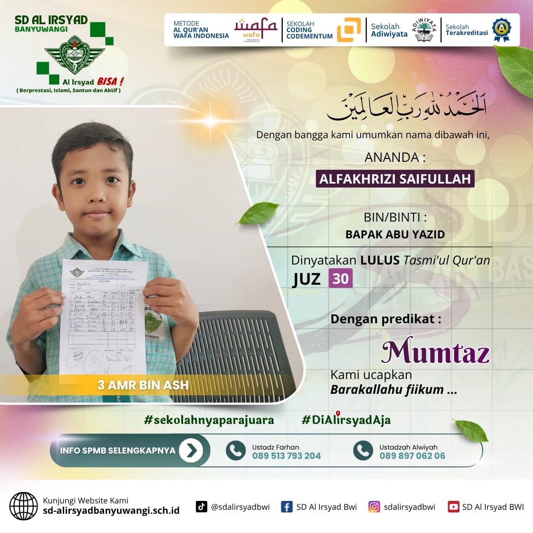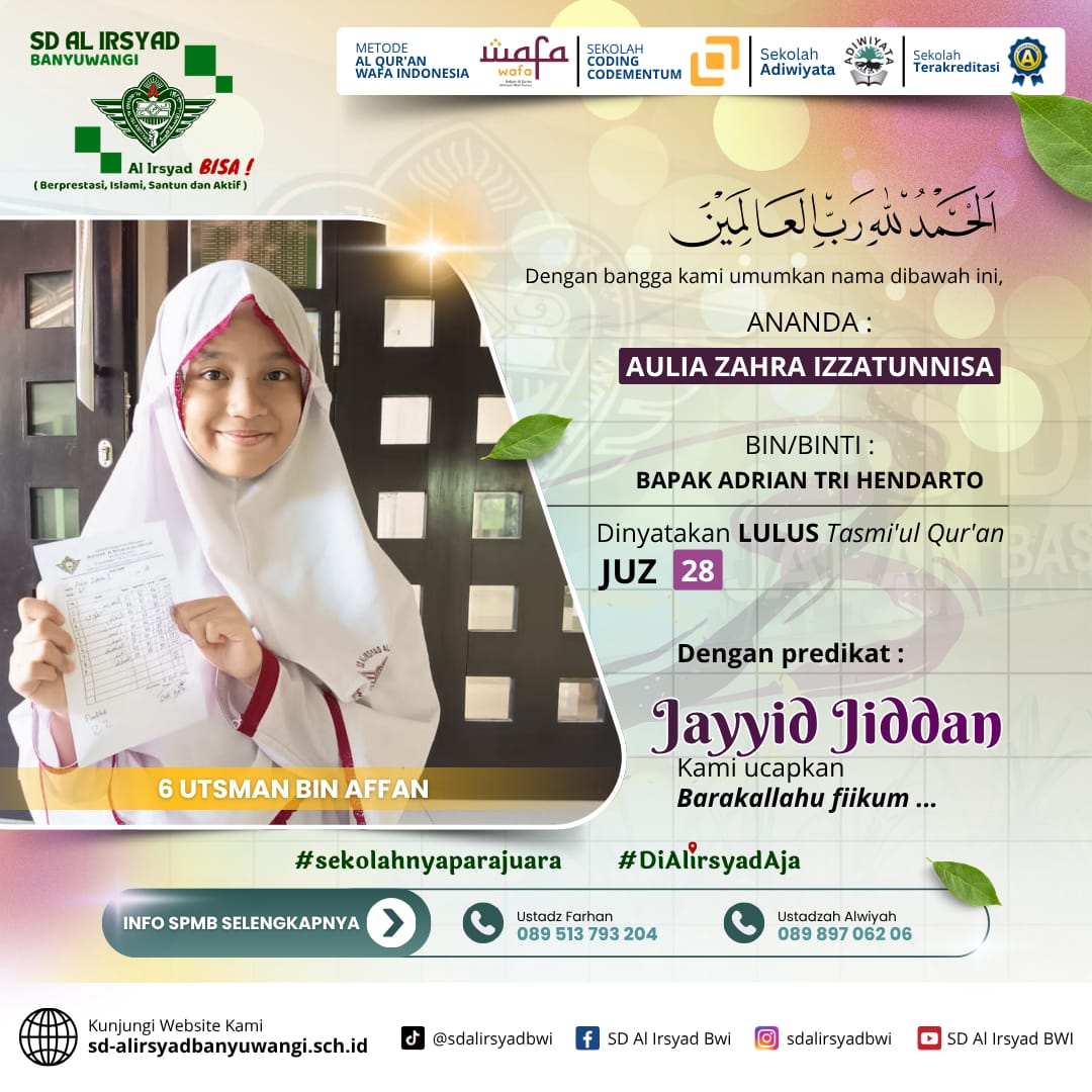 Dengan semangat kolaborasi antara sekolah dan orang tua, SD Al Irsyad Banyuwangi terus berkomitmen melahirkan generasi Qur’ani yang berakhlak mulia, berprestasi, dan siap menghadapi tantangan masa depan.