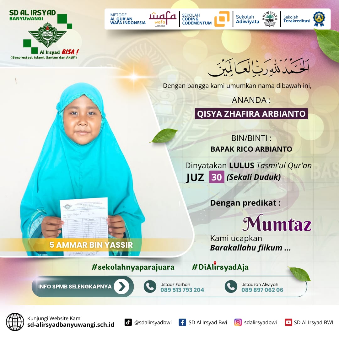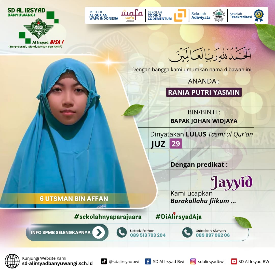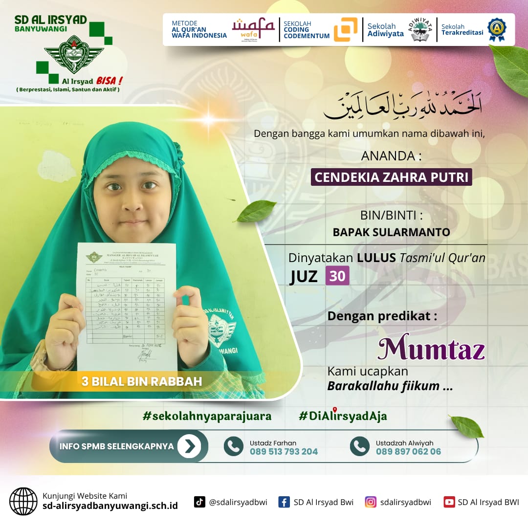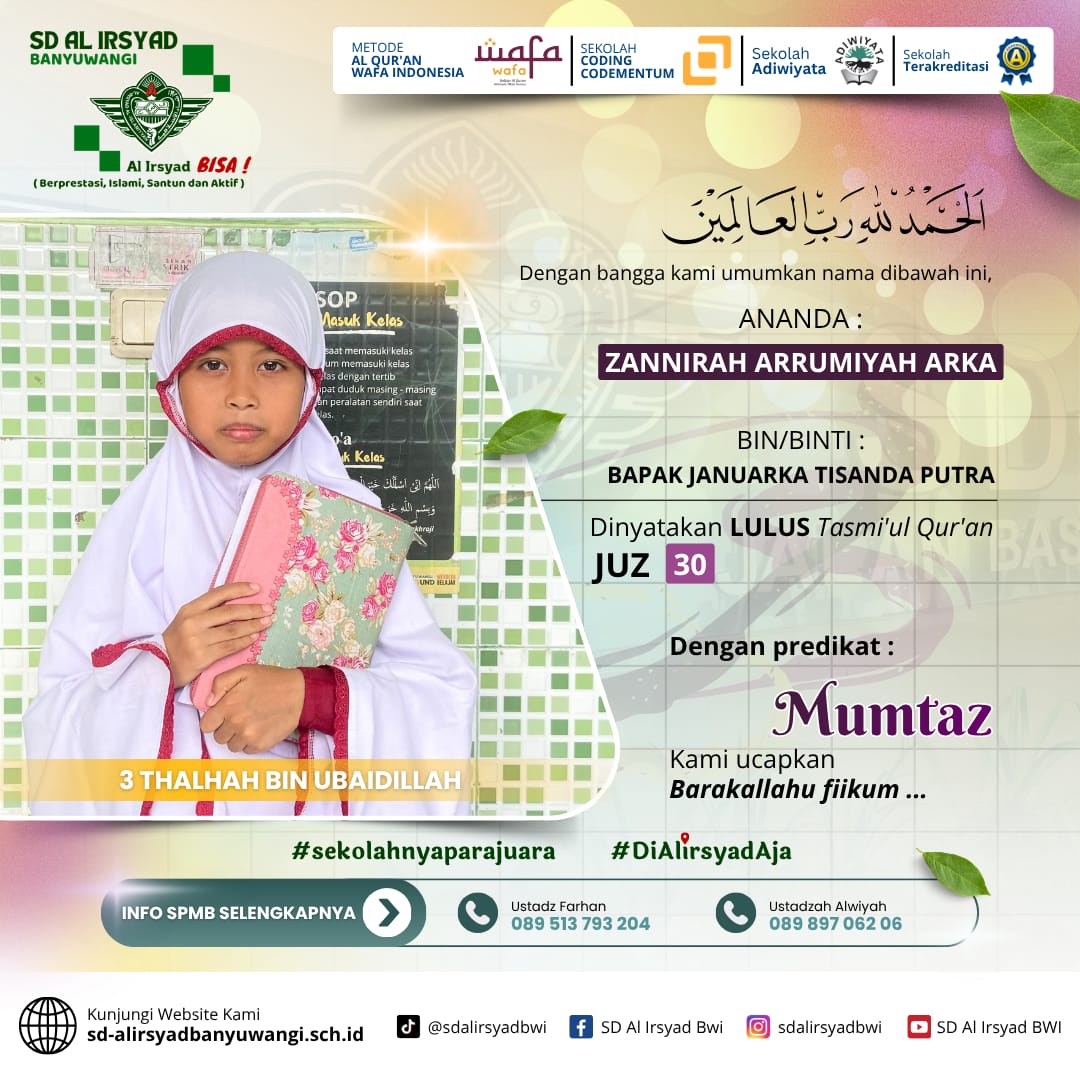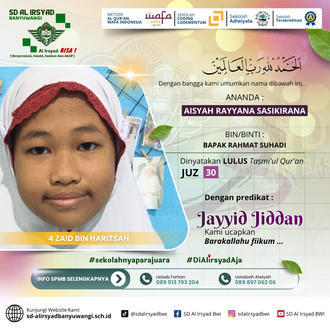 Dengan semangat kolaborasi antara sekolah dan orang tua, SD Al Irsyad Banyuwangi terus berkomitmen melahirkan generasi Qur’ani yang berakhlak mulia, berprestasi, dan siap menghadapi tantangan masa depan.